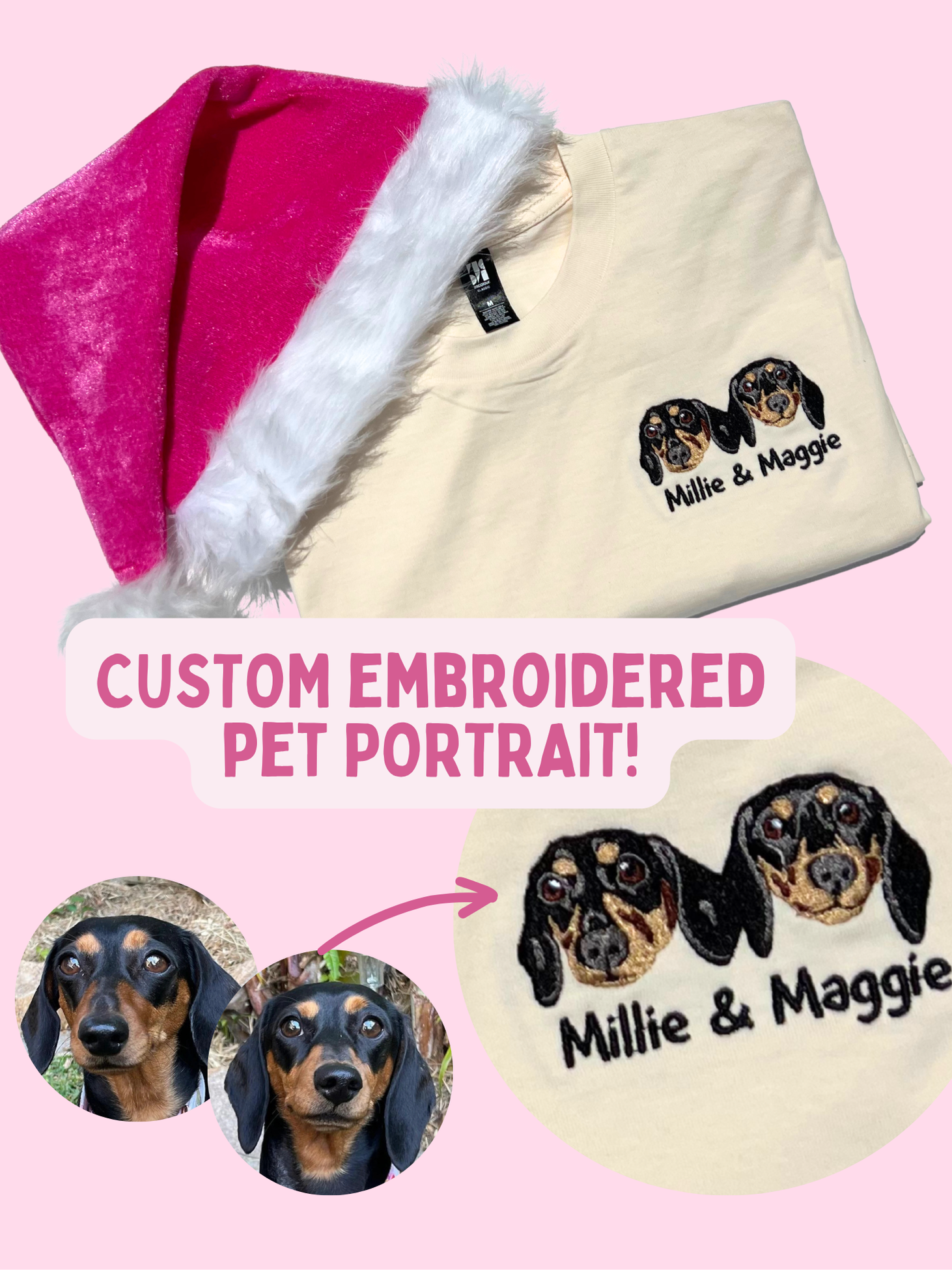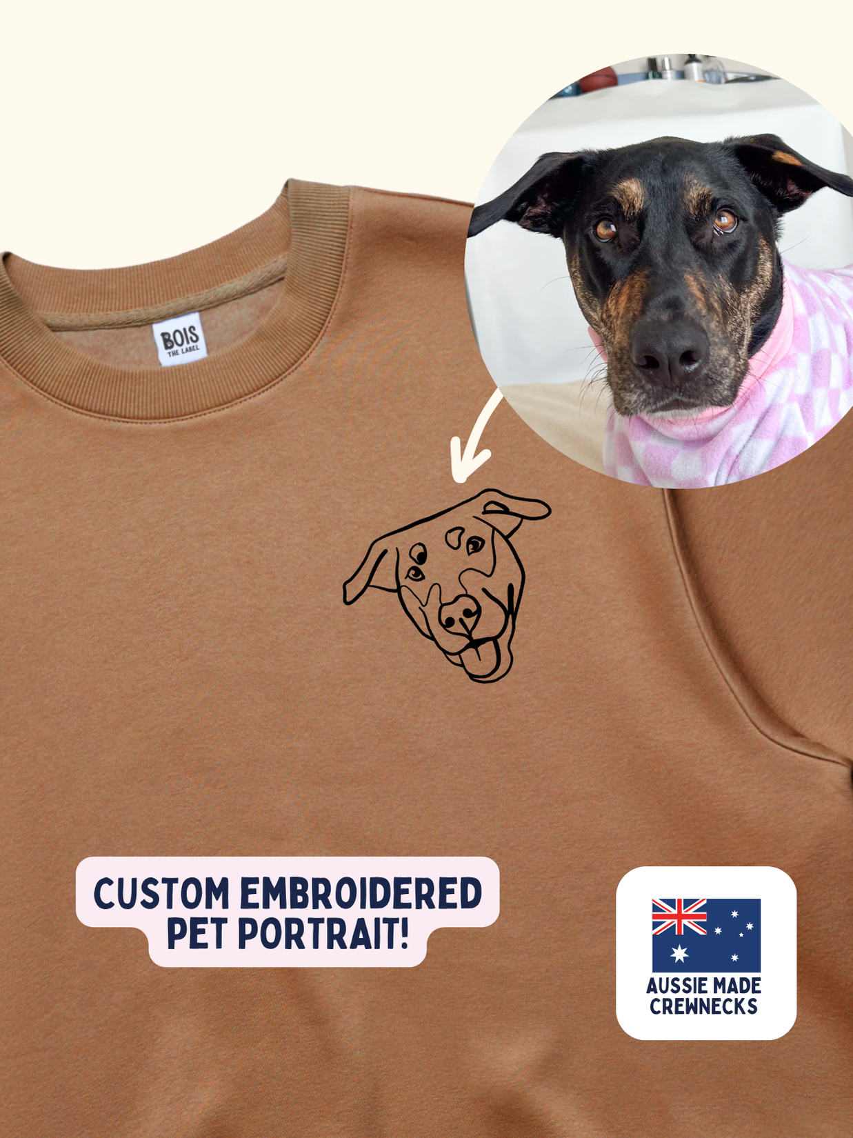 Get a custom pet portrait embroidered onto a BOIS crewneck or tshirt! The perfect personalized gift for pet owners, pet lovers, dog moms and dog lovers. These custom portrait t-shirts and sweaters make a lovely remembrance gift for pets who have passed. Made in Australia with fast Australian shipping, right in time for the holidays.